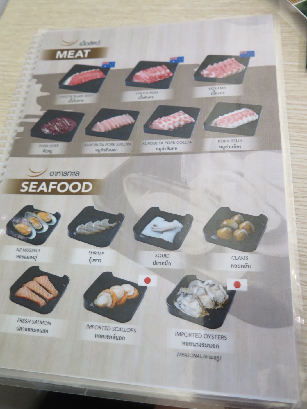 ส่วนอาหารโซนที่เป็นซีฟู๊ดสามารถเดินไปตักได้เองเลยค่ะ อย่างพวกเนื้อหมู เนื้อปลาแซลมอน ลูกชิ้น ผัก หรือน้ำจิ้ม หยิบได้สะดวก แต่ถ้าเป็นพวกซูชิจะต้องเขียนใส่ใบสั่งเล็กๆ แล้วให้พนักงานค่ะ หลังจากสั่งซูชิไปก่อนแล้วก็มาเดินตักของเตรียมลงหม้อค่า เพิ่งจะเคยกินชาบูที่มีหอยเชลล์ญี่ปุ่นให้ด้วย ชอบมากกก ตัวใหญ่บึ้มม