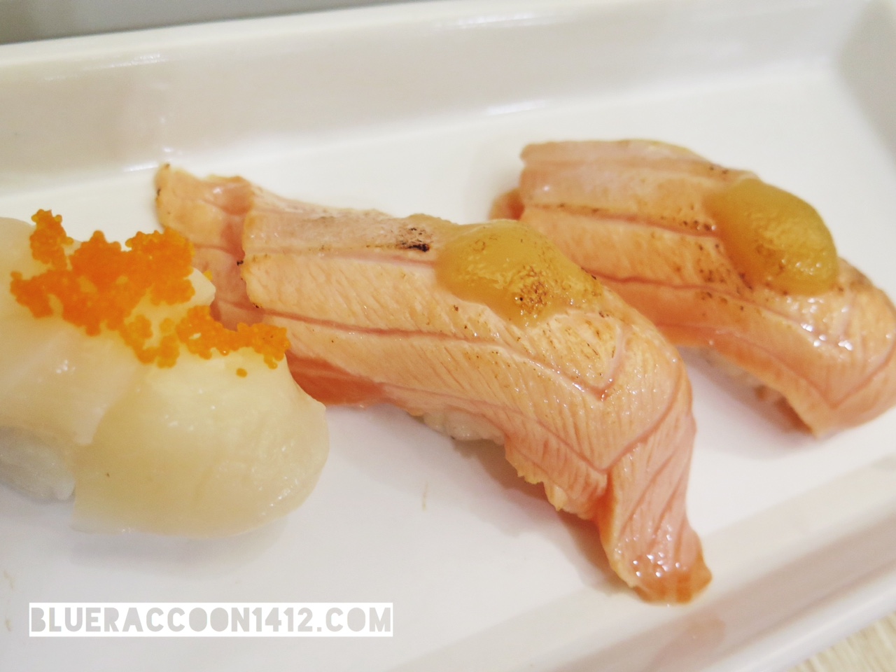 ถัดไปเป็นซูชิปลาแซลมอนแบบพ่นไฟด้านบน ทานแล้วฉ่ำๆดีค่ะ เหมาะกับคนที่ไม่ชอบกินดิบๆเกิน แล้วก็ด้านข้างๆเป็นหอยเชลล์ค่ะ