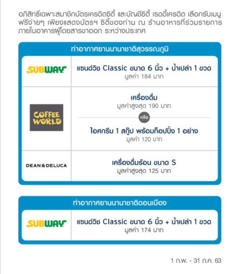 - Subway แลกแซนด์วิช Classic ขนาด 6 นิ้ว + น้ำเปล่า 1ขวด มูลค่า 184 บาท แลกได้ทั้งที่สุวรรณภูมิ และดอนเมือง