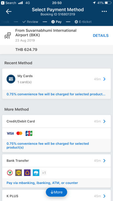 6. หลังจากที่กด Book Now ก็จะมีช่องให้กรอกข้อมูลการติดต่อ พอกรอกเรียบร้อยก็มาสู่ขั้นตอนการชำระเงิน ซึ่งแต่ละช่องทางจะมีการคิดค่าบริการที่ต่างกันไป สำหรับเราเลือกแบบจ่ายตัดบัตรเครดิต ซึ่งจะ มีค่าธรรมเนียม 0.75% convenience fee แต่ถ้าไม่อยากโดนหักค่าธรรมเนียม ก็เลือกแบบโอนเข้าบัญชีธนาคารก็ได้นะ แล้วแต่สะดวกกันเลย