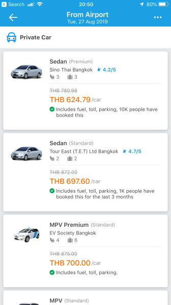 3.เลือกแบบรถและบริษัทที่Operate ได้ มีให้เลือกทั้งรถเก๋ง รถตู้ หรือรถหรูไฮโซก็มีนะ ในรูปจะระบุว่ารถแต่ละประเภทนั่งได้กี่คน และราคานี้ก็รวมค่าทางด่วนไว้แล้ว