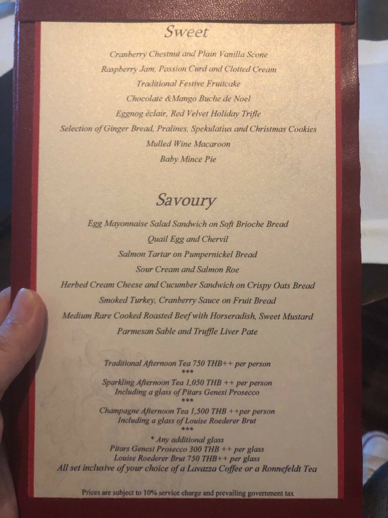 สถานที่ Siam Kempinski Bangkok หนุมาน บาร์ ชั้นล็อบบี้,Harrods Tea Roomสยามพารากอน / เซ็นทรัล เอ็มบาสซี่,Laduréeสยามพารากอน,Mandarin Oriental Shopสยามพารากอนเฉพาะวันจันทร์ – ศุกร์,TWG Tea Salon & Boutiqueสยามพารากอน/เอ็มโพเรียม,Renaissance Bangkok R Bar ชั้น 1,AVANI Riverside Bangkokลองบาร์ ชั้น 11
