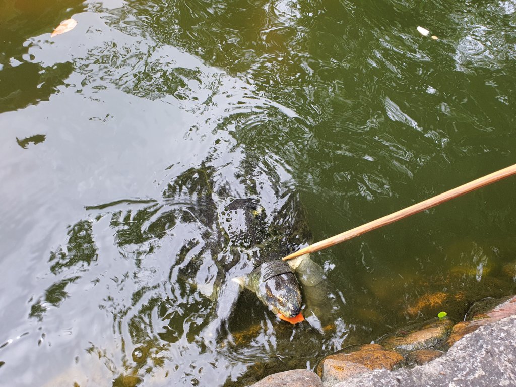 วิธีการให้ก็คือเราจะได้อาวุธเป็นไม้ยาวๆ สำหรับจิ้มลูกชิ้นหรือมะละกอ แล้วก็ให้กับน้องตรงๆ เพราะถ้าโยนไปในน้ำเลย น้องเต่าจะกิยอาหารไม่ค่อยสะดวก