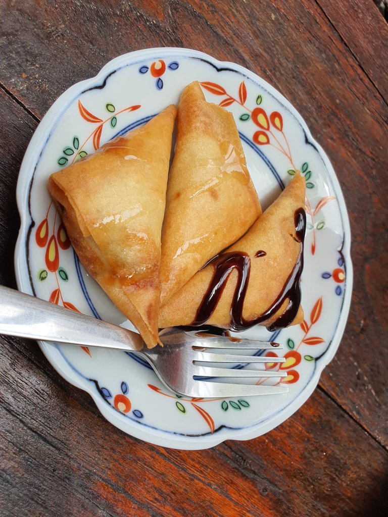 🍽กลางวันกินเซ็ทขนมจีนแกงไก่พร้อมของหวานเป็นซามัวซ่ากล้วยราดน้ำผึ้งและชาเย็นที่ Helo Nomsod ราคา 79 บาทเท่านั้น พิกัด ตรงโบสถ์ซางตาครู้สคอนแวนต์ นอกจากจะอร่อยแล้วยังราคาถูกด้วย อิ่มจุกๆกันไปอีก1มื้อ