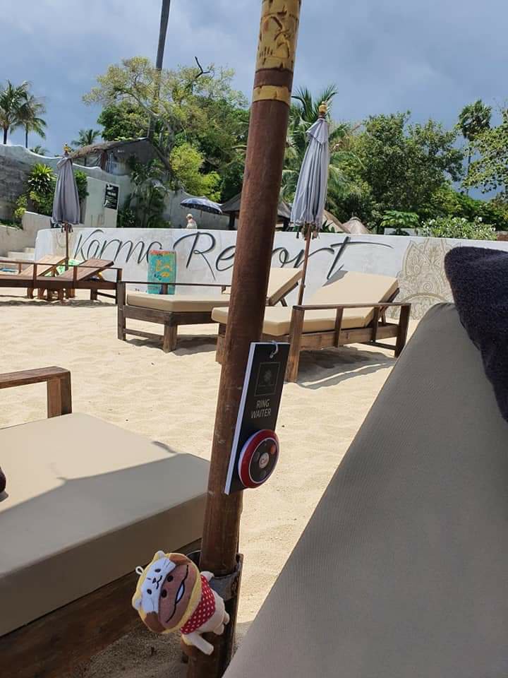 โดยทีมงานในรีสอร์ทนี้ มาจากประเทศต่างๆ 7 ประเทศ ดังนั้นเราจะเห็นพนักงานที่นี่มีทั้งคนไทย ฝรั่ง มีความหลากหลายจริงๆ (ปล.เพื่อนแอดถึงกับปลื้มพ่อหนุ่มฝรั่งหุ่นล่ำที่คอยดูแลสระน้ำ แต่แอดไม่มีรูปนะคะ555😝) เค้าเอากริ่งมาให้กด ไว้เรียกพนักงานเสิร์ฟตรงริมชายหาดได้ค่ะ
