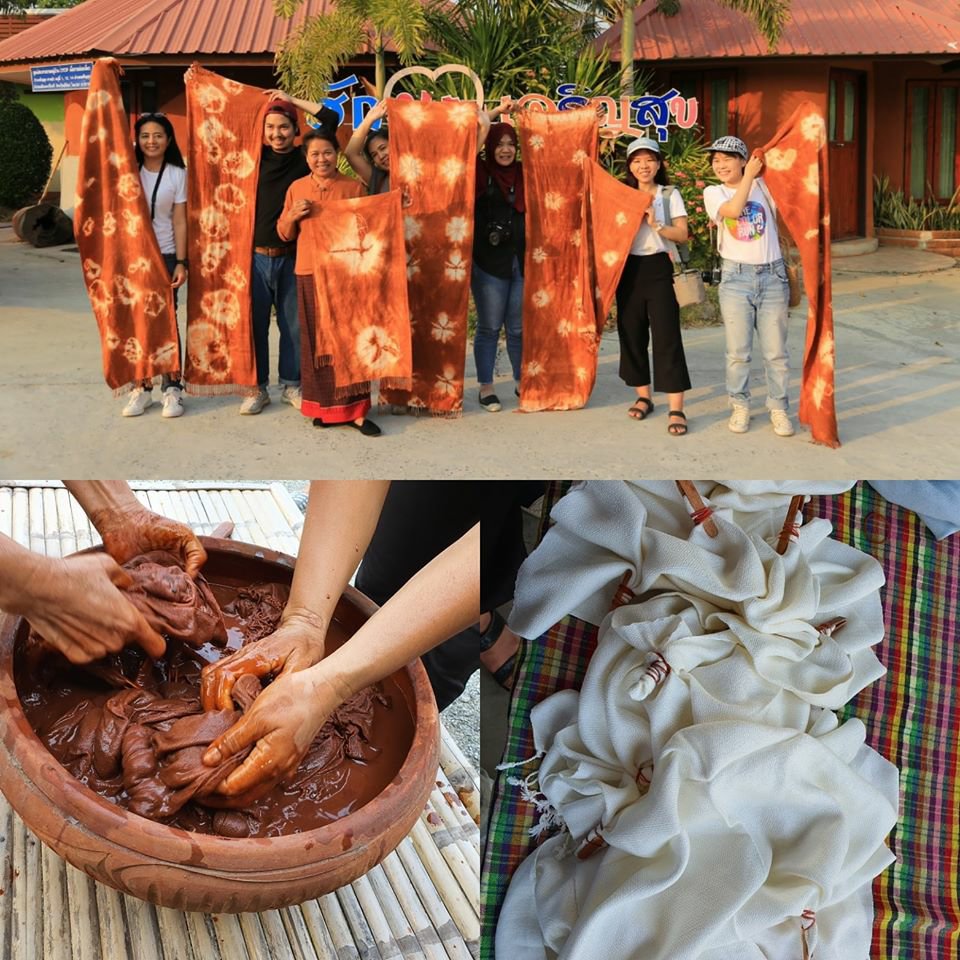 พวกเราได้มีโอกาสลองทำผ้ามัดย้อมที่มีผืนเดียวในโลก ด้วยการทดลองทำลวดลายเองอีกด้วยค่ะ แม้ว่าหน้าตาจะออกมาไม่สวยงามเหมือนอย่างที่ชาวบ้านทำ แต่เราก็ภูมิใจในผลงานของพวกเราทุกคนค่า 555 และสำหรับคนที่ทำเองไม่สวยอย่างเราก็สามารถใช้เงินแก้ปัญหาด้วยการอุดหนุนสินค้ามัดย้อมดินภูเขาไฟได้เลยค่ะ มีทั้งเสื้อ ผ้าพันคอ หมวกสวยๆ ราคาไม่แพงเลย