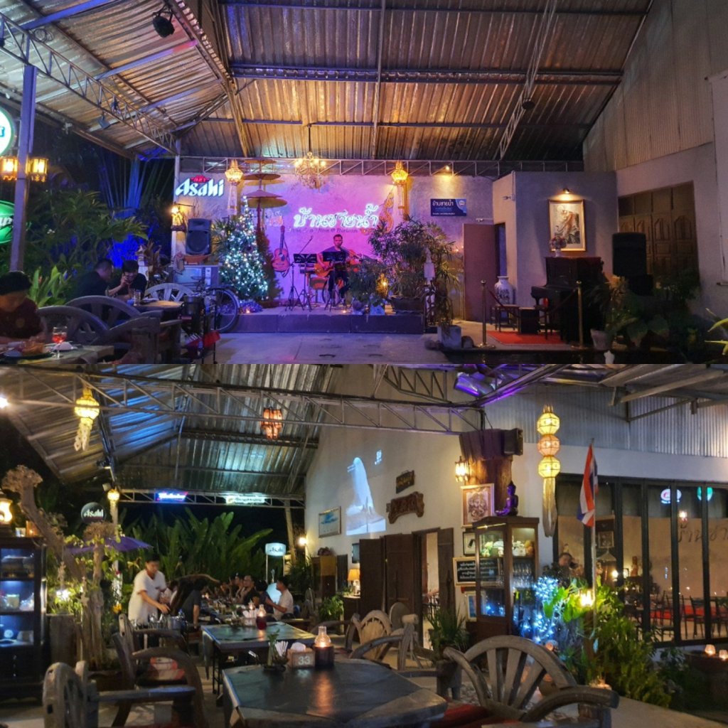 ร้านนี้ติดริมน้ำ และมีดนตรีสดในตอนเย็น เหมาะกับการนั่งรับลม บรรยากาศดีงาม เหมาะกับการนั่งชิลล์กับกลุ่มเพื่อนมากค่ะ