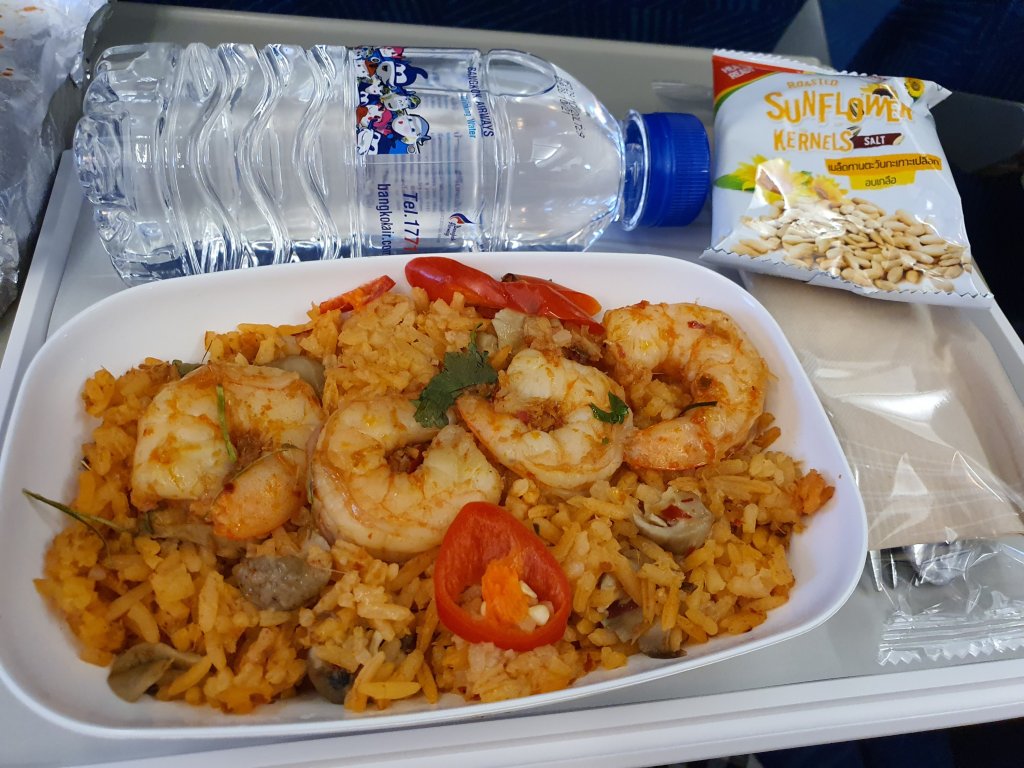 ส่วนอาหารจานหลัก เค้าจะเสิรฟ์บนเครื่องจ้า อย่างในรูปเป็นข้าวผัดต้มยำกุ้งค่ะ มาพร้อมน้ำเปล่า คนละ 1 ขวด
