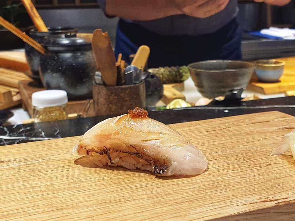 😋คำที่ 2 ปลาตาเดียวHirame ปลาเนื้อขาว เสิรฟ์กับมะนาวและเกลือ