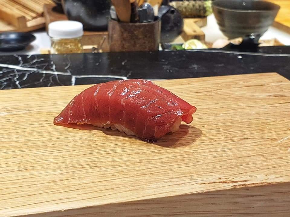 😋คำที่ 5 Akami เนื้อแดงของปลาทูน่าบลูฟิน ที่หมักซอสไว้ก่อนเพื่อความเข้มข้น 5-10นาที