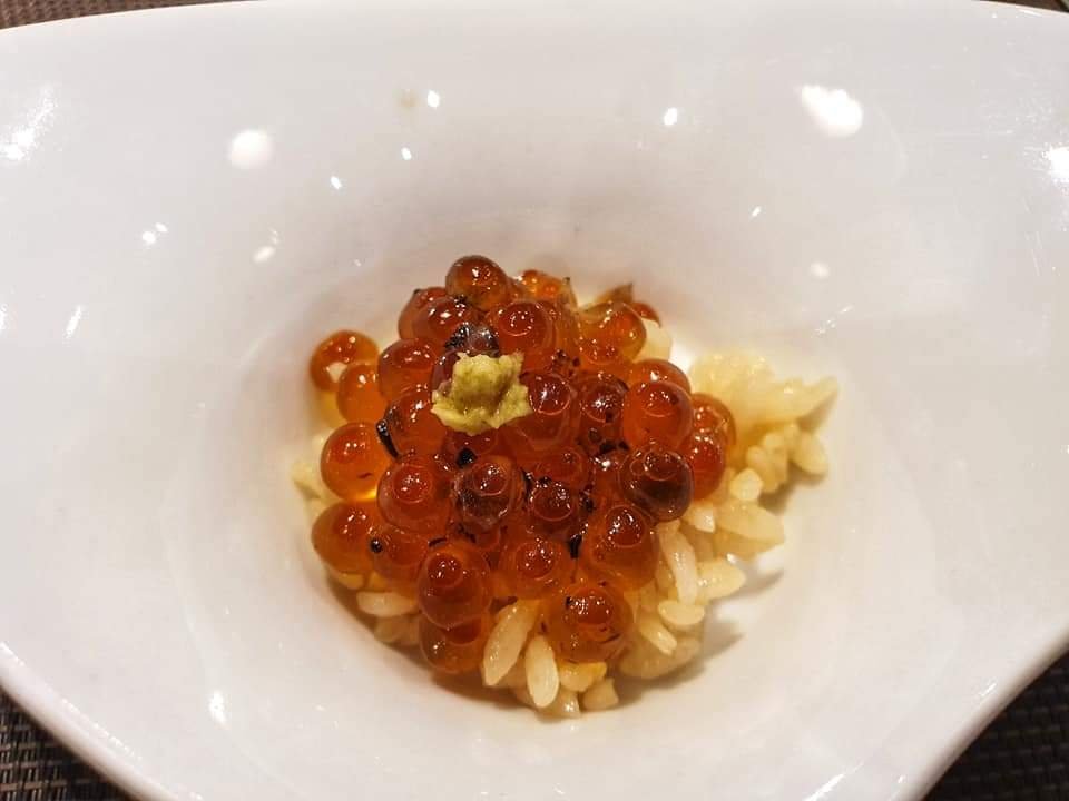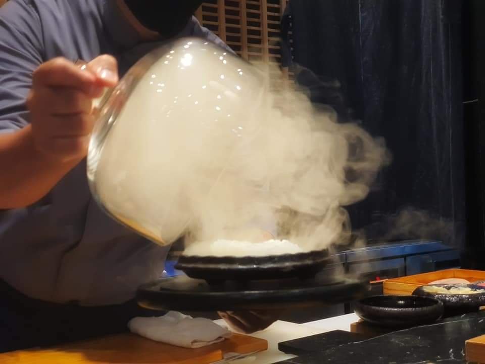 😋คำที่ 1 ปลาหมึกนำเข้าจากชุมพร เค้าจะนำIkuraนำไปดองกับส้มyuzuไว้ก่อนแล้วมาSmokedโดยใช้ไม้หอม7ชนิด ตอนเปิดออกมาเสิร์ฟเราก็จะเห็นควันพวยพุ่งดูอลังการเลยจ้า