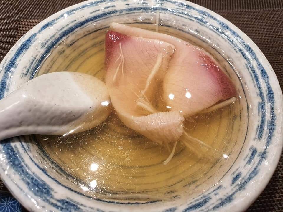 คอร์สที่ 9 ซุปใส ปลาฮามาจิ ที่เสิรฟ์ให้เห็นปลาดิบก่อนให้เราเอาน้ำซุปร้อนๆราด ตัวปลาก็จะสุก