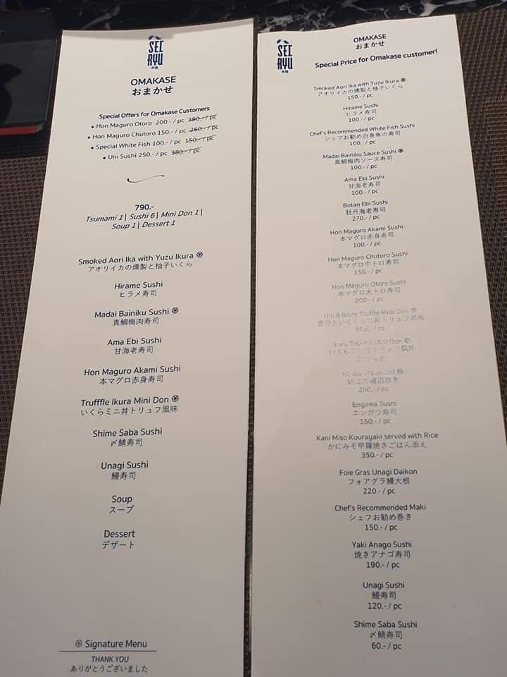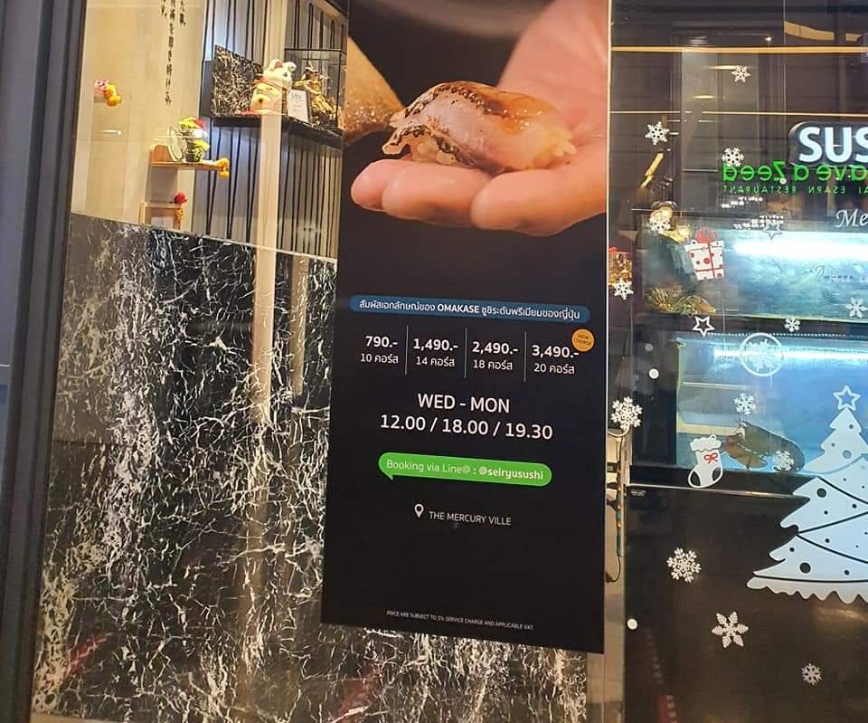 🍣รีวิวโอมากาเสะแบบไม่แพงเลย แต่รอคิวนานหน่อยที่ร้าน Seiryu Sushi ที่ตึก Mercury Tower เราต้องทำการจองรอบก่อน ผ่านทางLine ของที่ร้าน@seiryusushi พร้อมโอนมัดจำครึ่งหนึ่ง ขนาดแอดเลือกรอบเย็นวันธรรมดา เวลา 18:00ยังรอคิวเป็นเดือนเลยจ้า สนนราคาคอร์สละ 790 บาทที่ราคาถูกสุดจะได้ 10 คอร์ส ไปจนถึงแพงสุดที่ 3,490 บาทมี 20 คอร์สจ้ะ