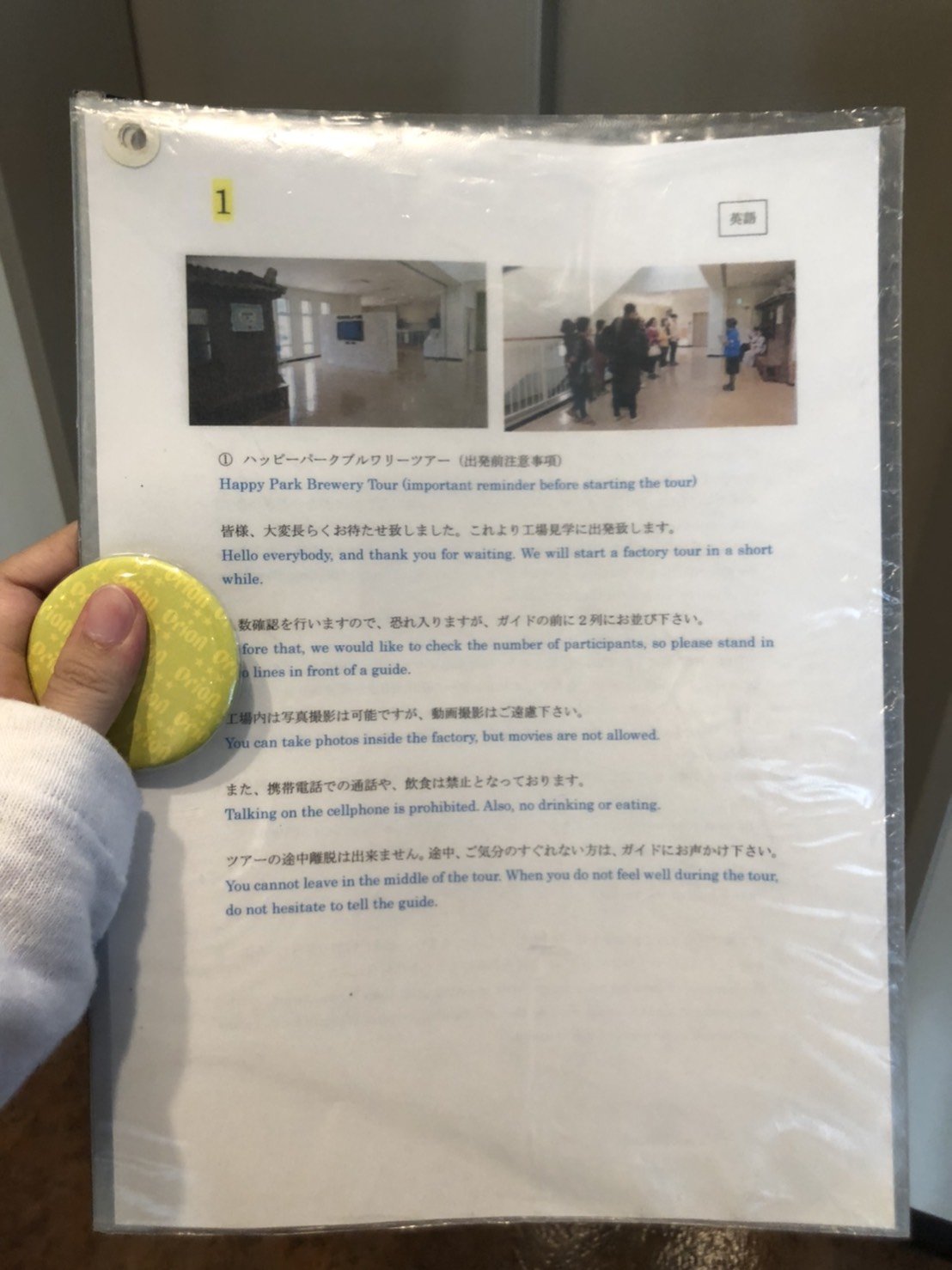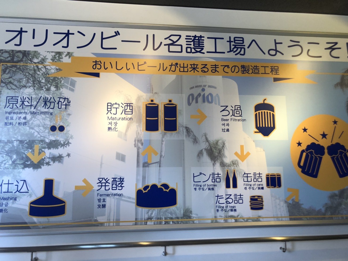 Orion Beer เป็นเบียร์ตัวแทนท้องถิ่นของโอกินาว่า เกาะทางตอนใต้สุดของประเทศญี่ปุ่น ถ้าใครเป็นคอเบียร์แนะนำให้มาค่ะ ชมกรรมวิธีการผลิตเบียร์เสร็จก็จะได้ชิมเบียร์สดคนละแก้วด้วย ^^ เมื่อมาถึงเวลาที่เราจองรอบแล้วก็ต้องไปลงชื่อกันก่อน โดยปกติจะใช้เวลาทั้งหมด 60 นาที แบ่งเป็นช่วงทัวร์ 40 นาที และช่วง Tasting beer 20 นาที